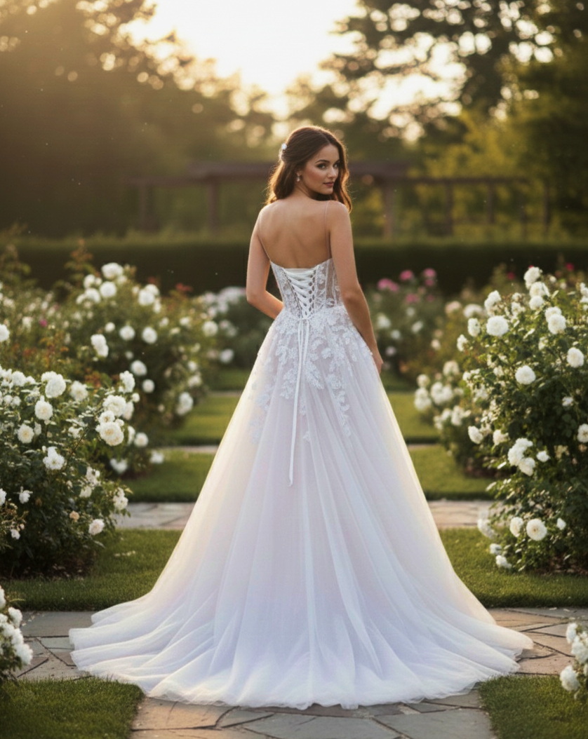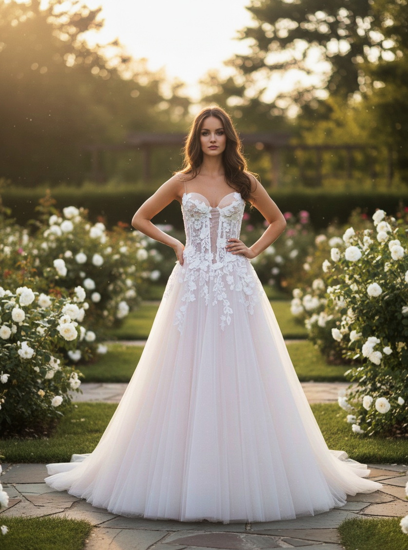 Átmenet: A felsőrész csipkemintái finoman „lefolynak” a szoknya alsó szakaszára, ezzel elmosva a határt a fűző és a szoknya között.