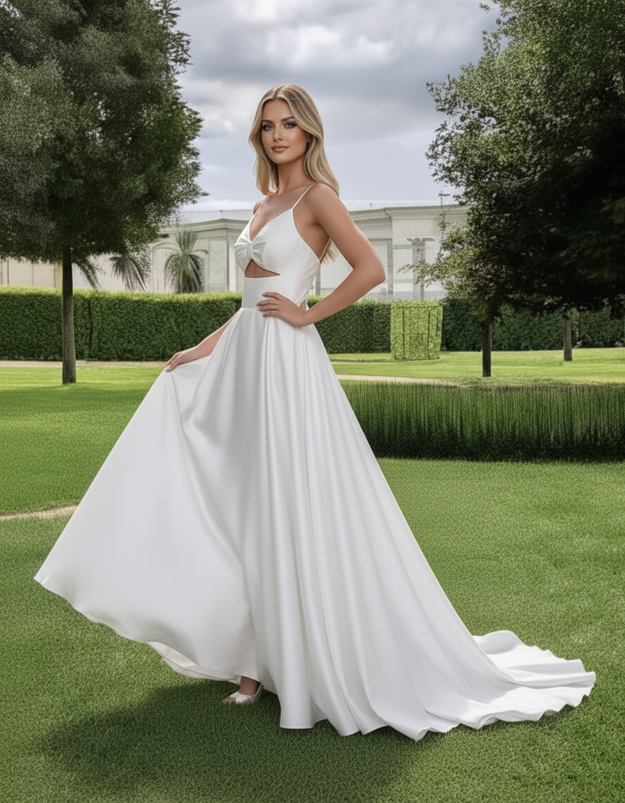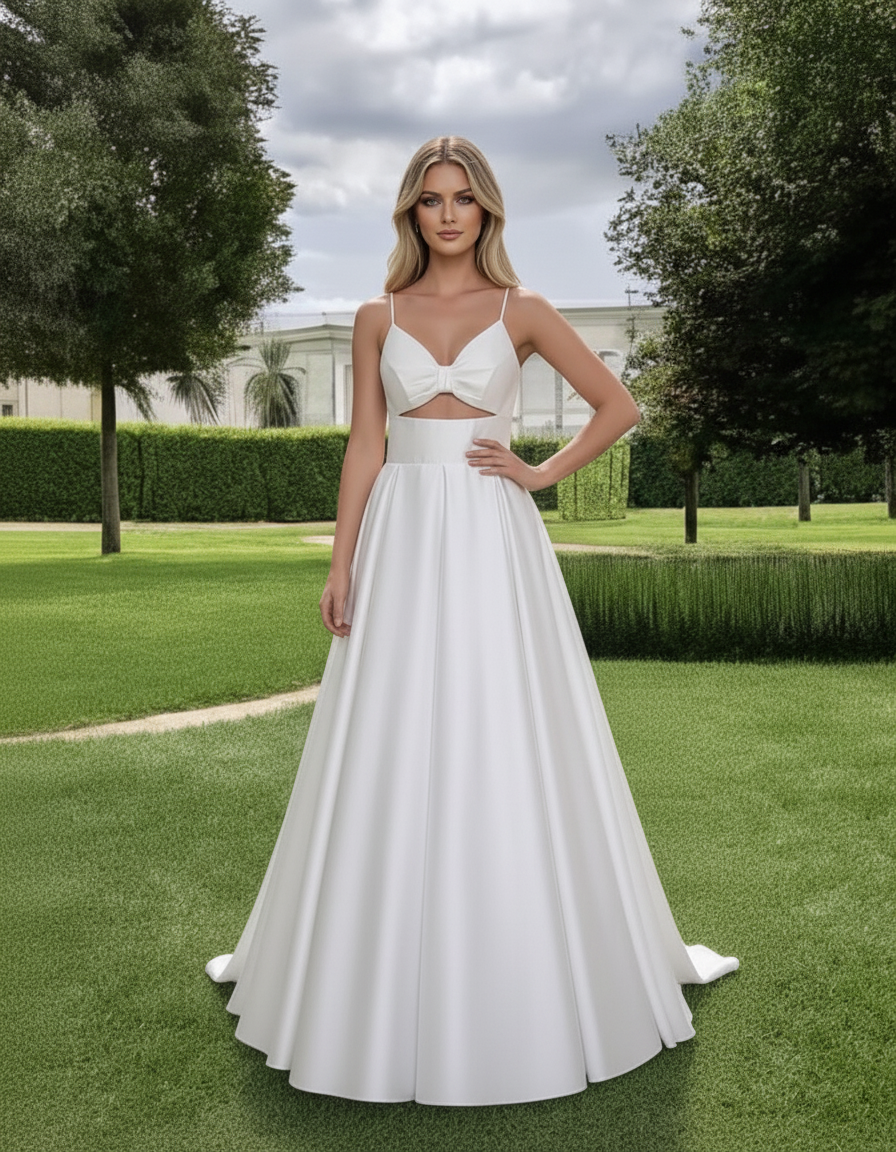 Szatén kivágott esküvői ruha. Az esküvői ruha választása minden menyasszony számára egy álom beteljesülése. Ha olyan stílust keresel, amely egyszerre elegáns és lenyűgöző, akkor a szatén, derékban kivágott esküvői ruha lehet a tökéletes választás. Ez a ruha nem csupán kiemeli a női alakot, hanem a szatén anyag fénye és gazdagsága olyan varázslatos hangulatot teremt, amelyet senki sem fog elfelejteni.