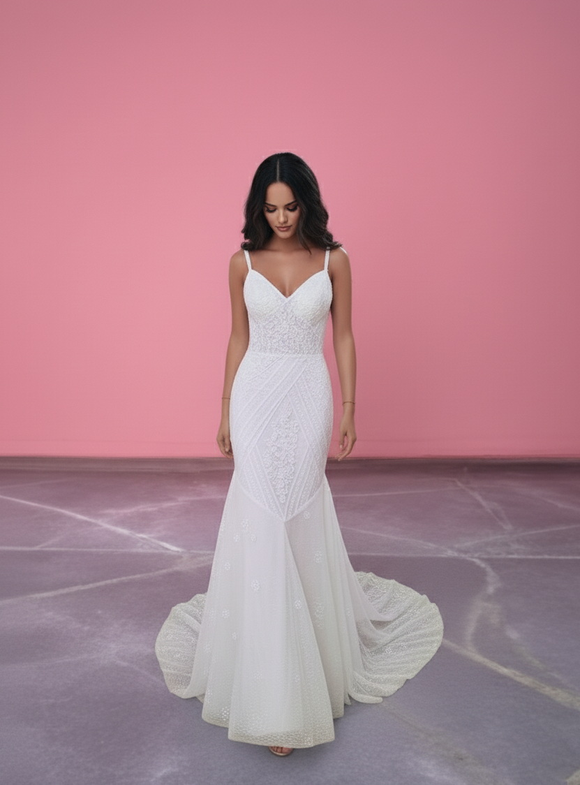 A tejfehér pamutcsipke sellő menyasszonyi ruha tökéletes választás azoknak a menyasszonyoknak, akik elegáns, nőies és kifinomult megjelenést szeretnének az esküvőjük napján. Ez a típusú ruha ötvözi a klasszikus csipkét a modern sellő szabással, amely egy időtlen, mégis divatos választást biztosít.