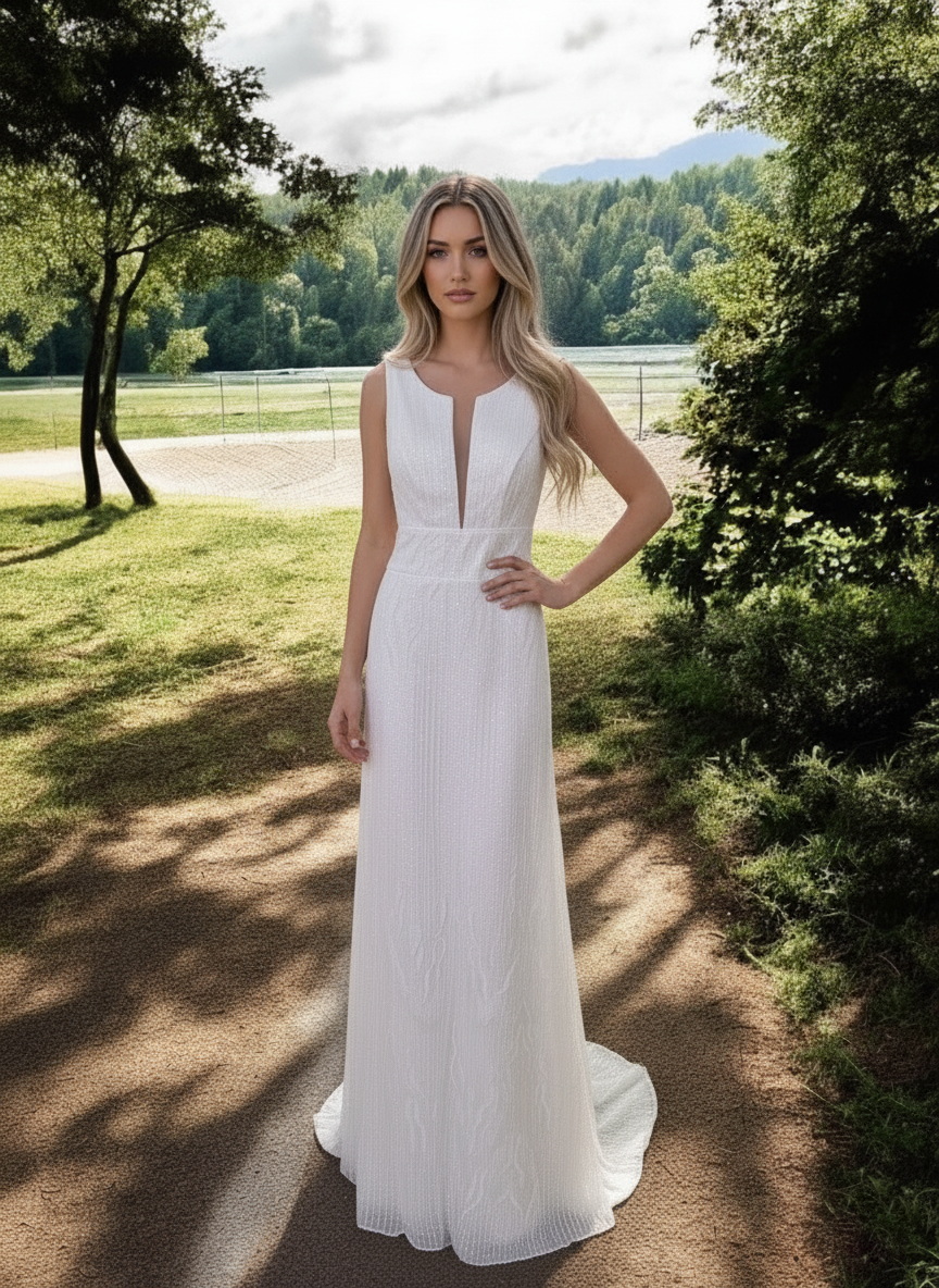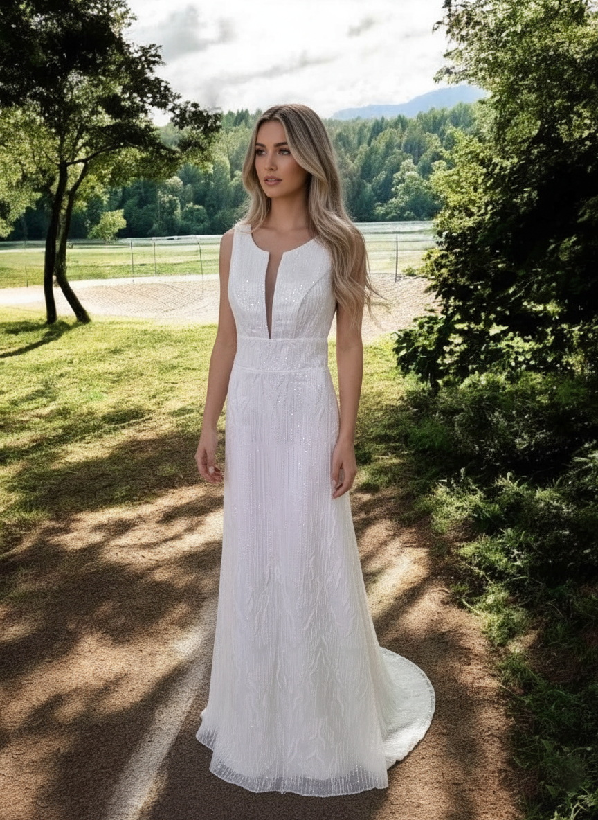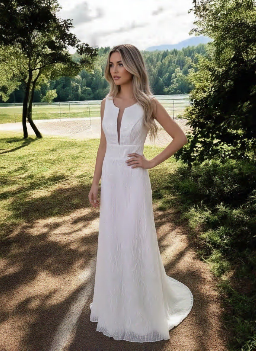 Ez a ruha tökéletes választás egy elegáns, estélyi hangulatú esküvőre vagy városi környezetbe, ahol a menyasszony szeretne egyszerre kifinomultan és modernül tündökölni. A magas nyakú kialakítás és a csillogó részletek garantáltan felejthetetlenné teszik a megjelenést.