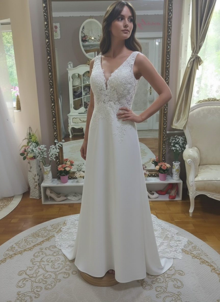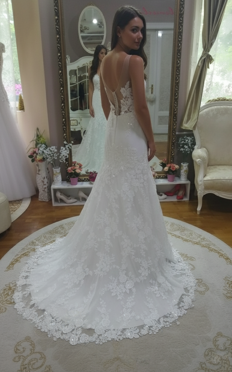 A dús csipke részletekkel ellátott ruha sokféle módon kiemelheti a női alakot. A karcsúsított fazon általában hangsúlyozza az alak vonalait, így előnyös lehet a karcsúbb testalkatú menyasszonyok számára. A csipke részletek eleganciát és részletgazdagságot kölcsönöznek a ruhának, amely a romantikus hangulatot erősíti.