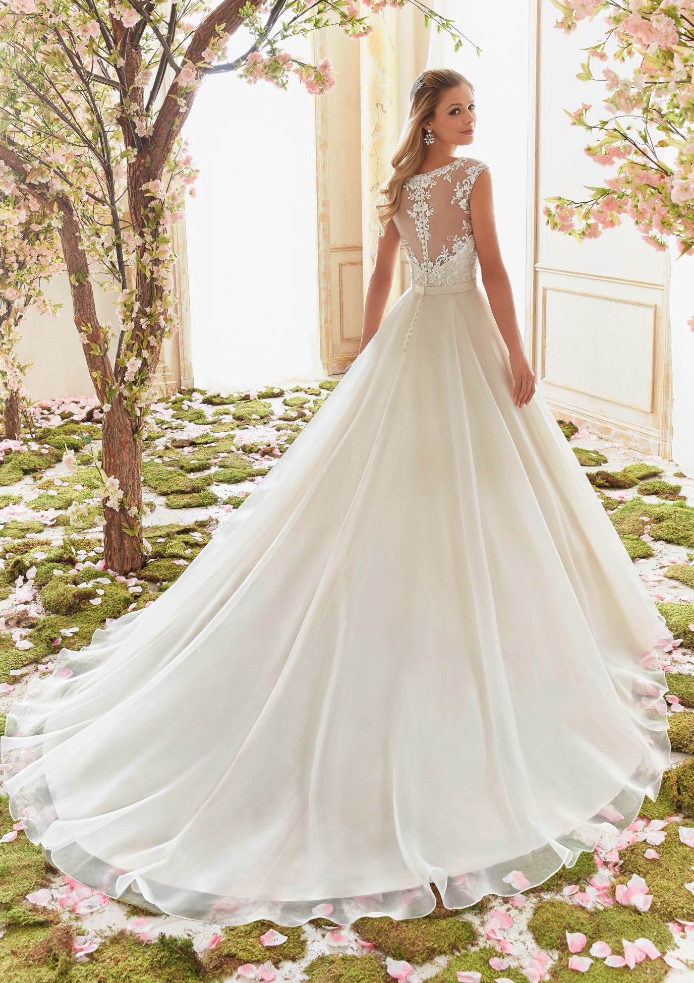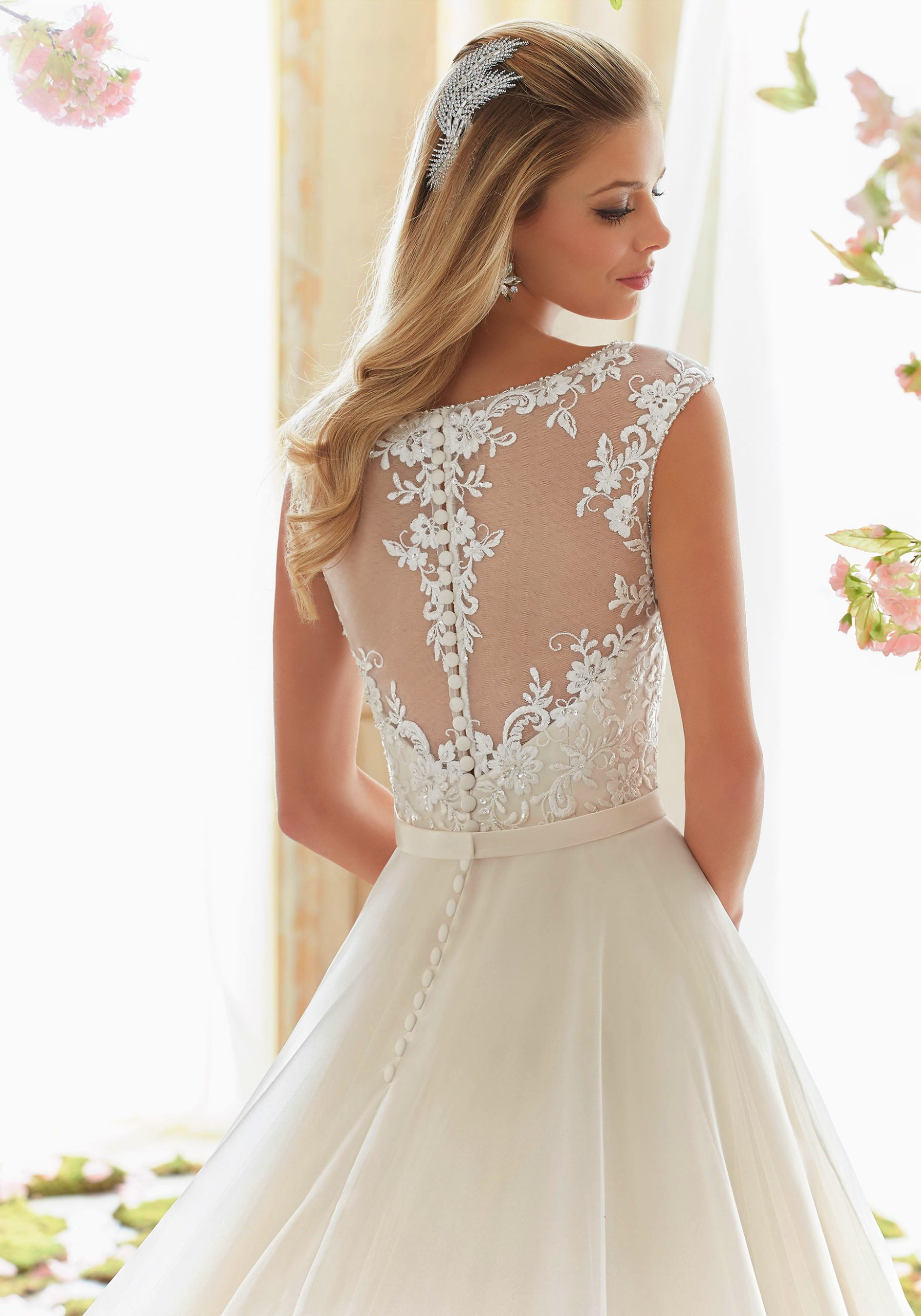 Hátoldal: A ruha háta különösen látványos; áttetsző „illúzió” tüll hátlapja van, amelyen a csipkeminta végigfut a gerinc mentén, középen pedig elegáns gombsor díszíti.