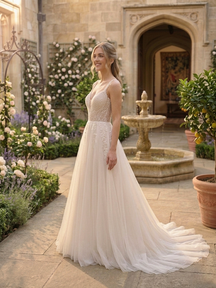 Uszály: A ruha hátul elegáns, közepes hosszúságú uszályban végződik, ami a tüll rétegeknek köszönhetően felhőszerűen terül el.