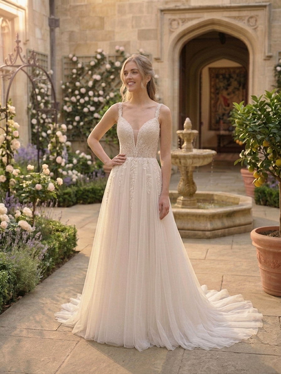 Pántok: Vékony, csipkével díszített pántjai vannak, amelyek finoman keretezik a vállakat.