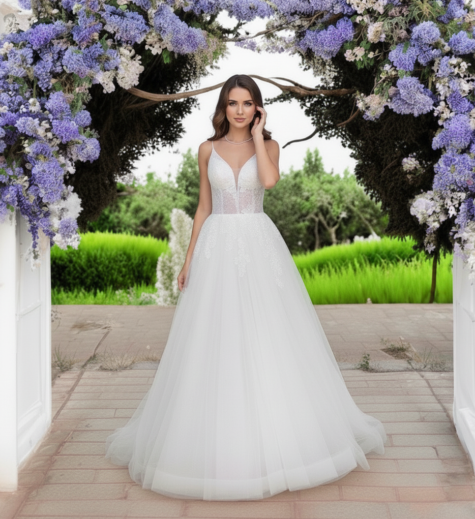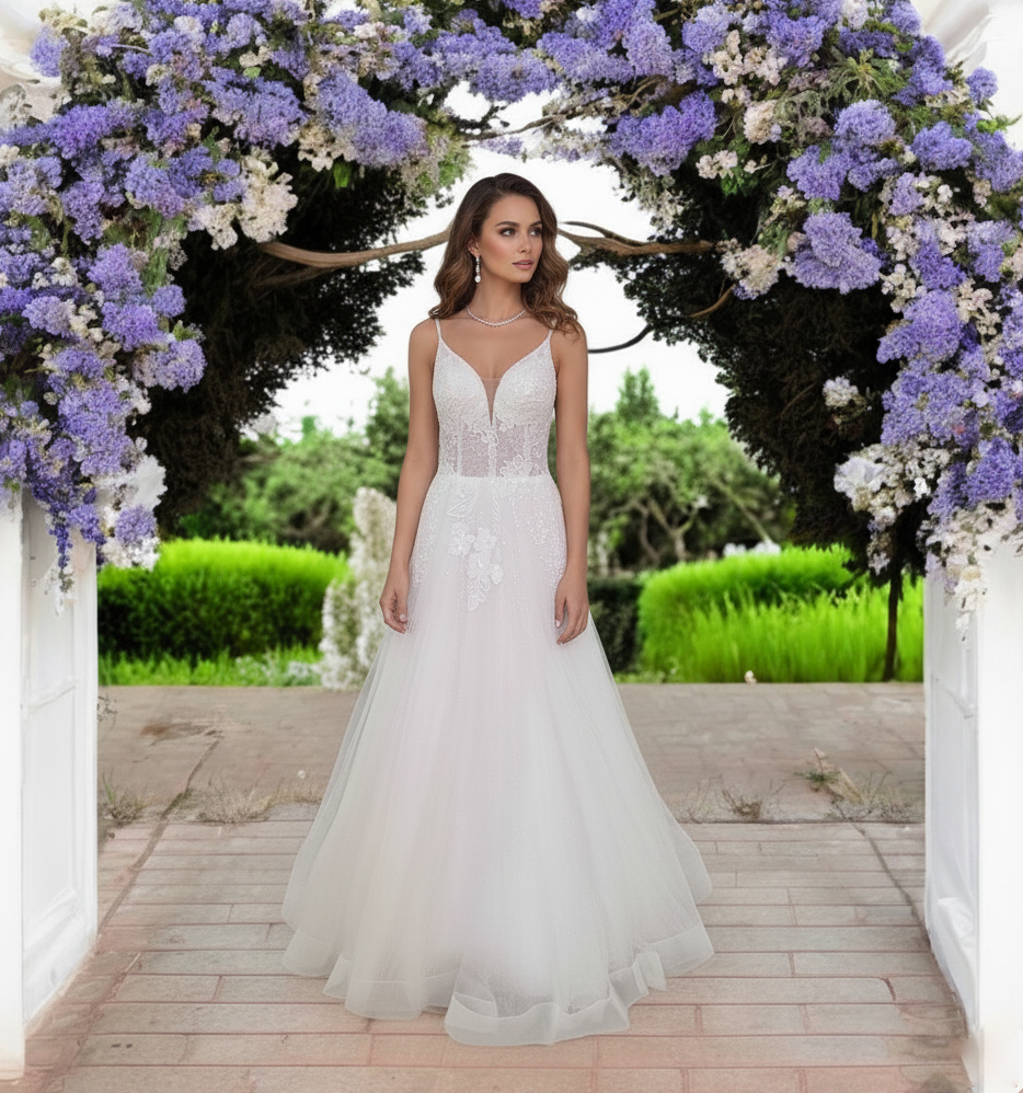 Tört fehér vállpántos csipkés menyasszonyi ruha. Felső része díszített spagetti pántokat kapott, így biztos tartást nyújt. Szív dekoltázsú míder része gyönyörűen formálja a mellkas részt. Finoman áttetsző felső része csipkével díszített, mely díszítés a szoknya részén is visszaköszön. Finoman elszórva apró gyöngyökkel díszített felső része romantikus és káprázatos látványt nyújt viselőének.